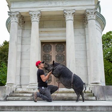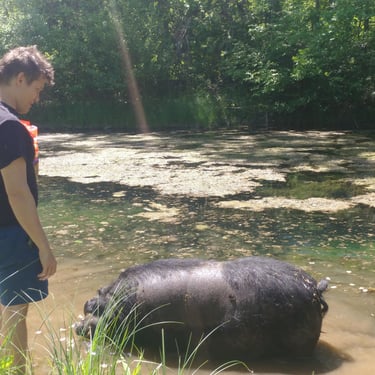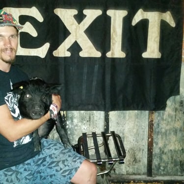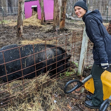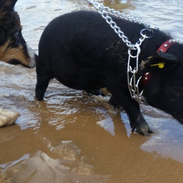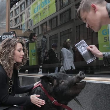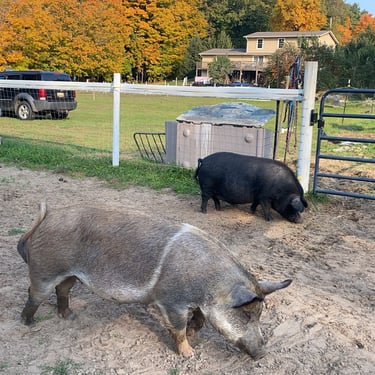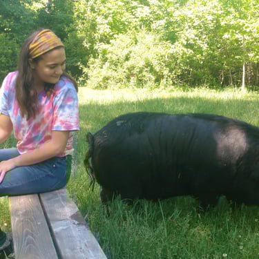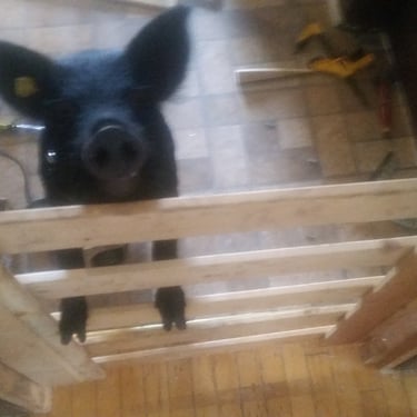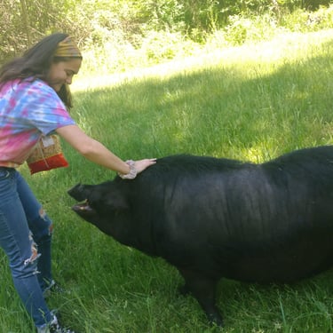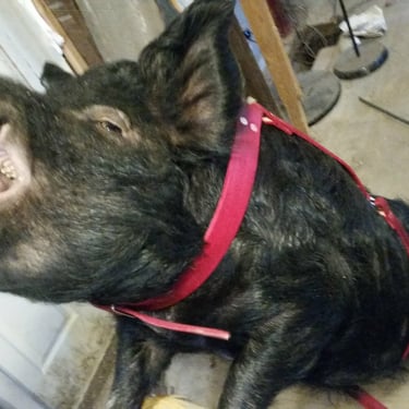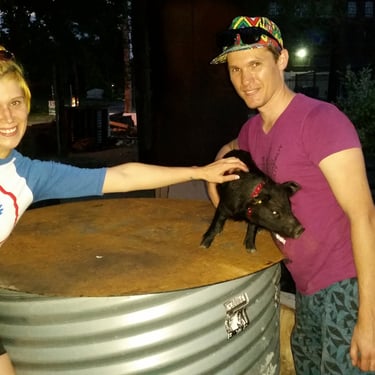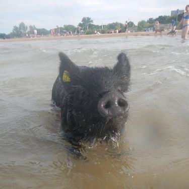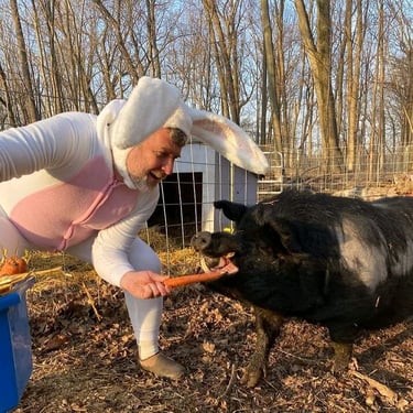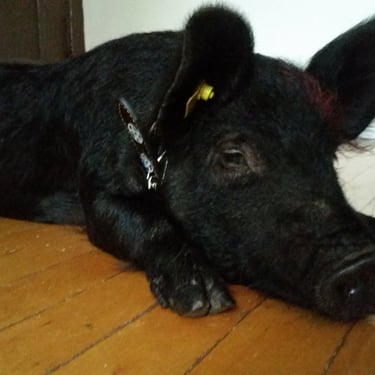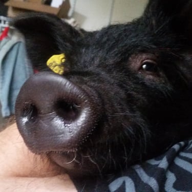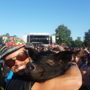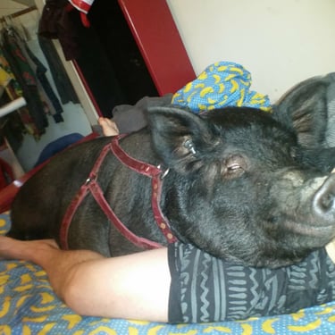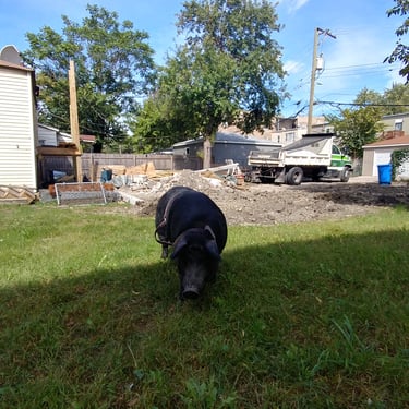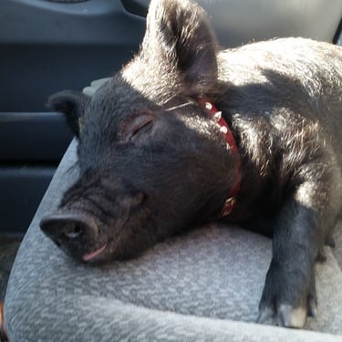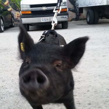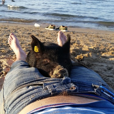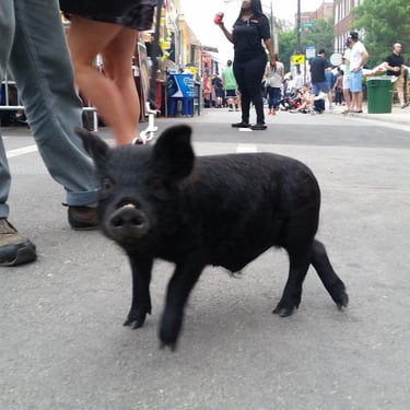 However, the challenge arose of how to transport a piglet from Red Oak, VA to Chicago, IL. My brother was not keen on the idea of relaying him from Detroit to Chicago on the way to my cousin's wedding in Minneapolis, MN, and he refused. Eventually, I found someone on Craigslist heading to a metal music festival in Detroit and negotiated for them to deliver the piglet to me. Our first meeting took place on 4th street in Detroitāthe same street where the 4th street fair is held, complete with peacocks and peahensāa moment captured on video, marking the beginning of our journey together and his first belly rub.
