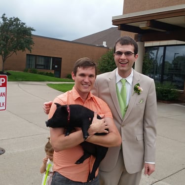 As unconventional as it may have been, "Old Boy" and I made an appearance, forever immortalized in their wedding photos. We just made the vows. Forever immortalized in my cousin's wedding photos, they'll have to explain how their cousin Kenny brought a darn pig to their wedding. How "thoughtful," right? From there, we went home to Chicago for the first time.